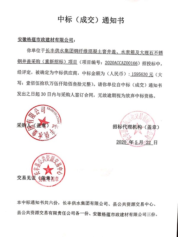 肥东县自来水厂2020年窨井设施材料采购中标通知书