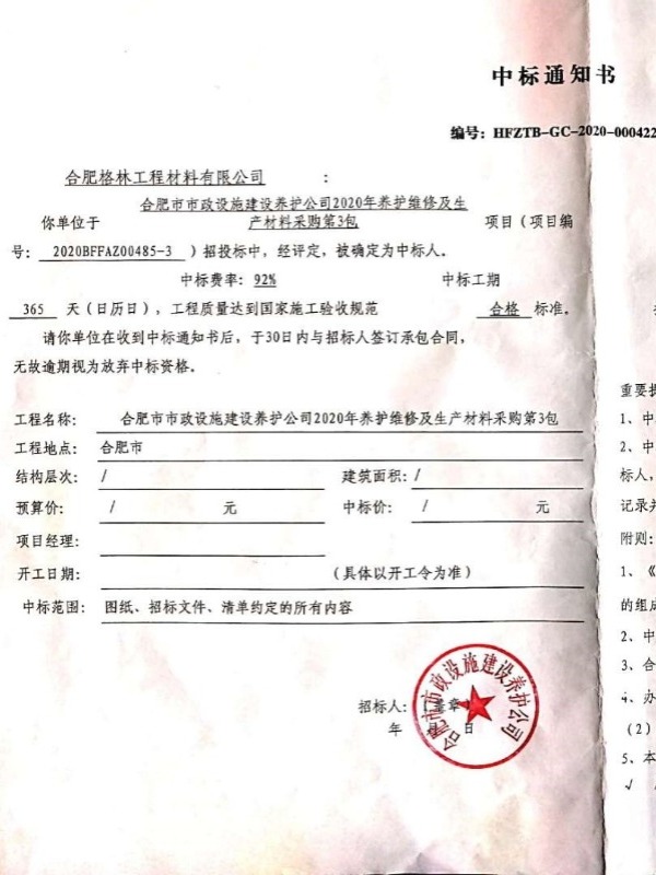 合肥市市政设施建设养护公司2020年养护维修及生产材料采购第7包中标通知书