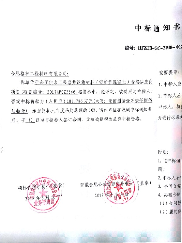 合肥供水工程窨井设施材料(钢纤维混凝土)合格供应商项目中标通知书