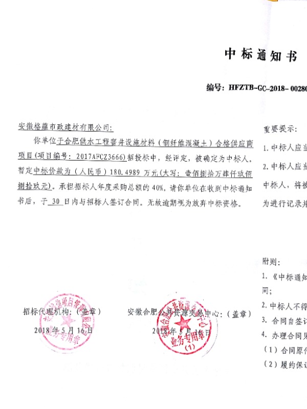 合肥供水工程窨井设施材料(钢纤维混凝土)合格供应商项目中标通知书(格林)