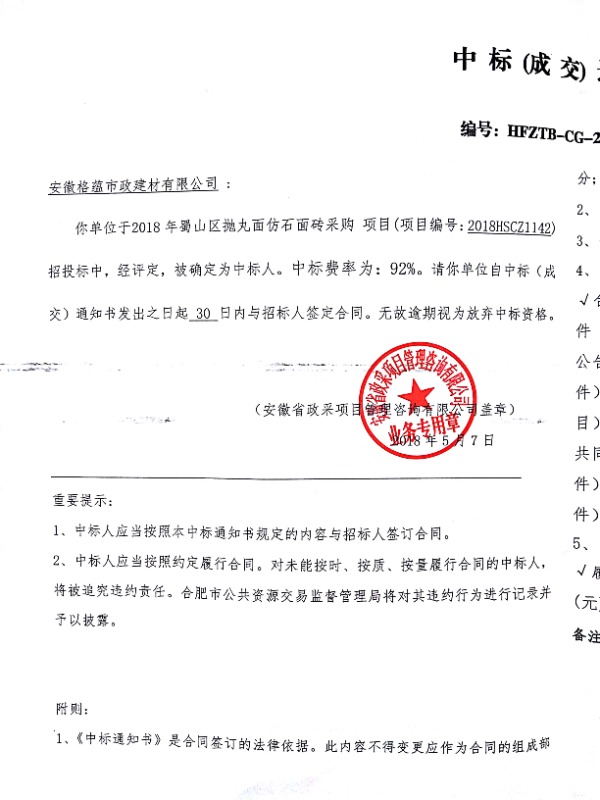 合肥供水工程窨井设施材料(钢纤维混凝土)合格供应商项目中标通知书