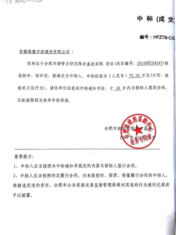 中国电信井盖中标通知书