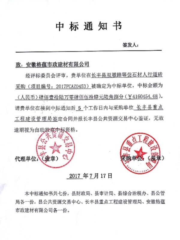 合肥市市政设施养护大修不锈钢井盖中标通知书
