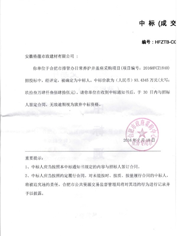 合肥排水管理办公室窨井设施材料采购中标通知书