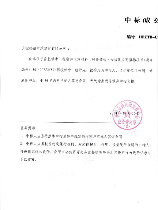 长丰自来水厂球铁井盖中标通知书