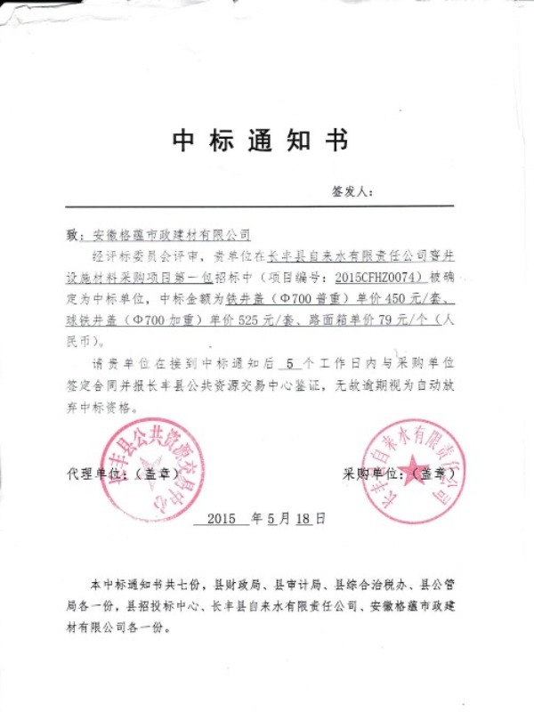 合肥排水管理办公室窨井设施材料采购中标通知书